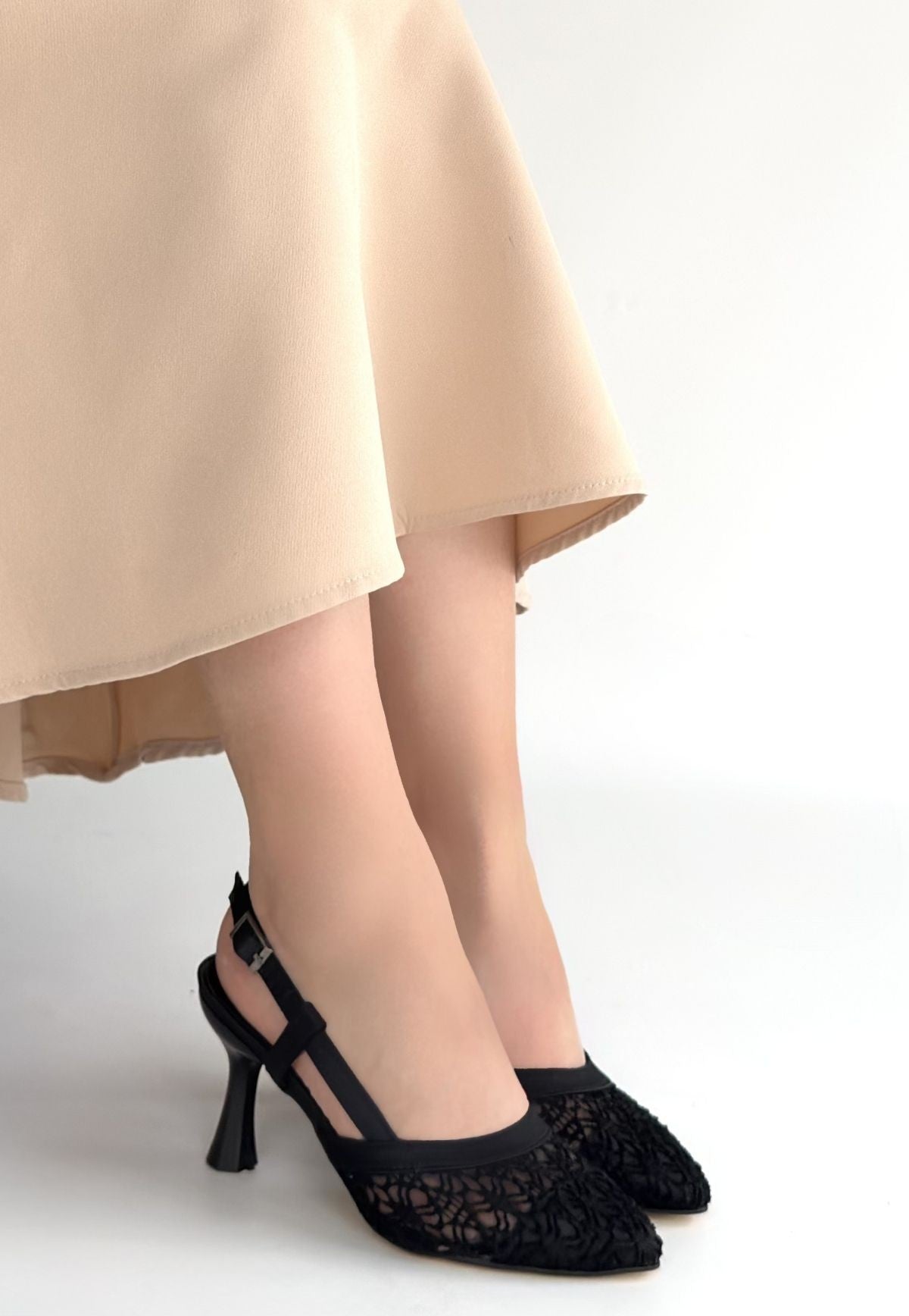 Ceta Siyah Cilt Tül Detaylı Topuklu Ayakkabı