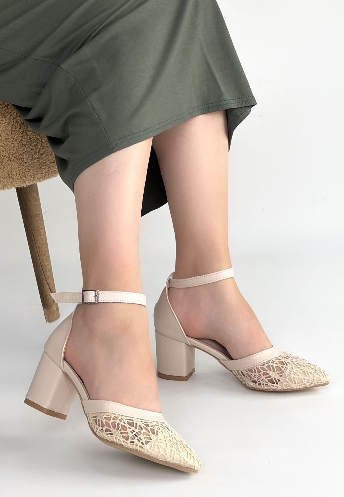 Dmop Bej Cilt Tül Detaylı Topuklu Ayakkabı